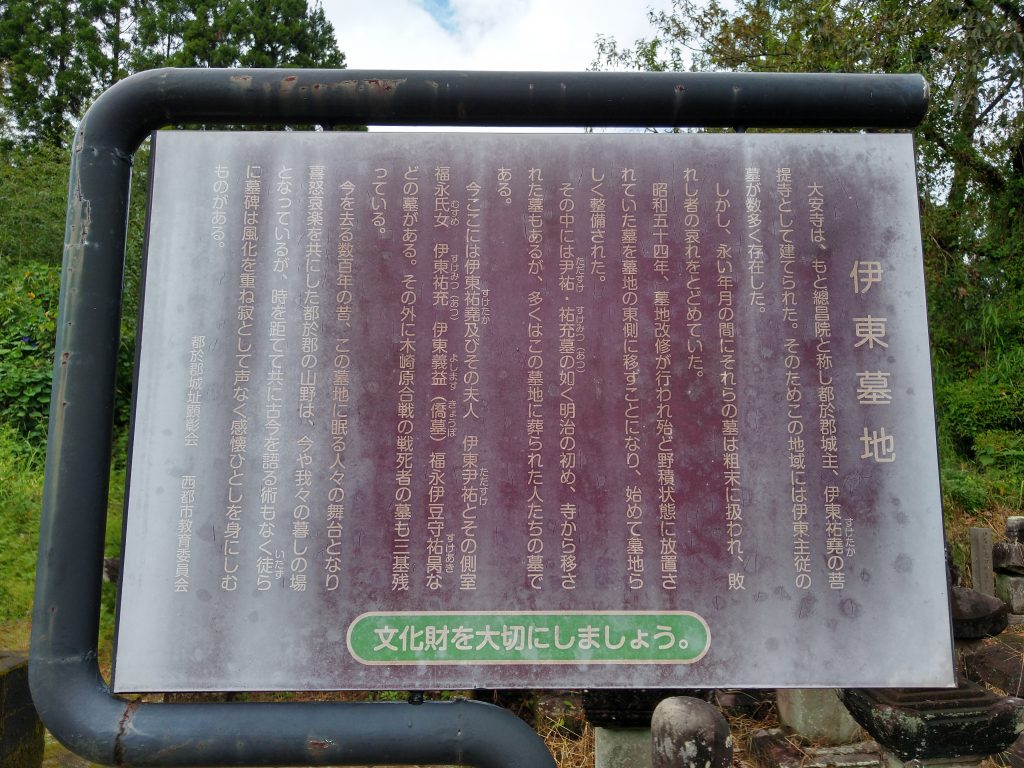 大安寺は、もと總昌院と称し都於郡城主、伊東祐堯の菩提寺として建てられた。そのためこの地域には伊東主従の墓が数多く存在した。